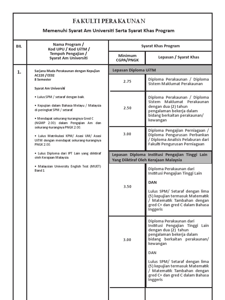 Diploma perakaunan uitm syarat. Minimum HPNGCGPA 300 Lepasan dari IPTA lain program diploma lain. 03082020 Universiti Teknologi Mara UiTM kini membuka permohonan untuk kemasukan pelajar sesi 2 20202021 ke UiTM bagi pelajar lepasan SPM yang berumur sekurang-kurangnya 16 tahun pada tarikh tutup permohonan dan memenuhi syarat kelayakan yang telah ditetapkan. Atau Mencapai HPNG minimum 300 dan lulus Diploma dari.